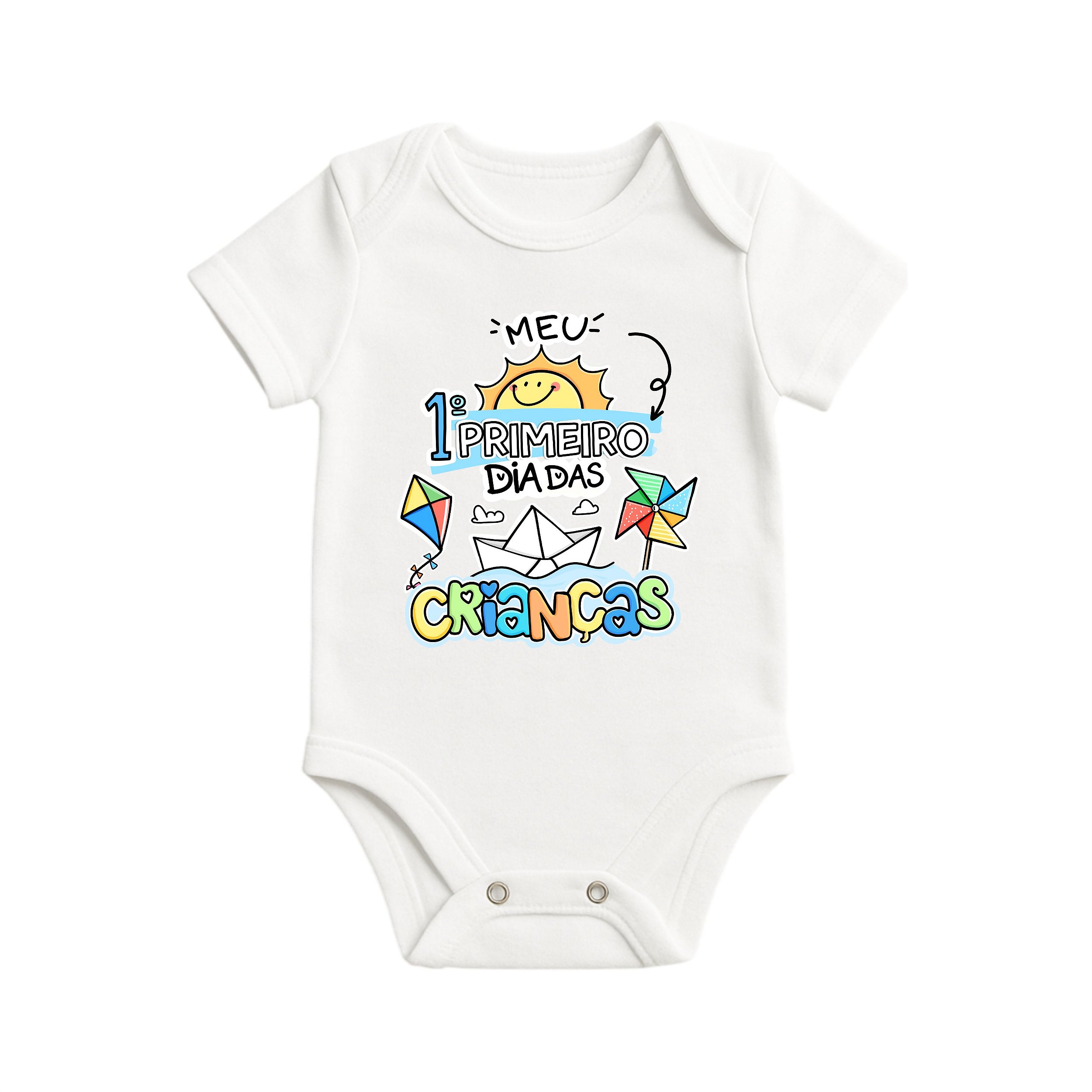 Body infantil branco - Meu primeiro dia das crianças (para meninos). Manga curta, confeccionado em 100% poliéster com elasticidade, garantindo conforto e praticidade no dia a dia.