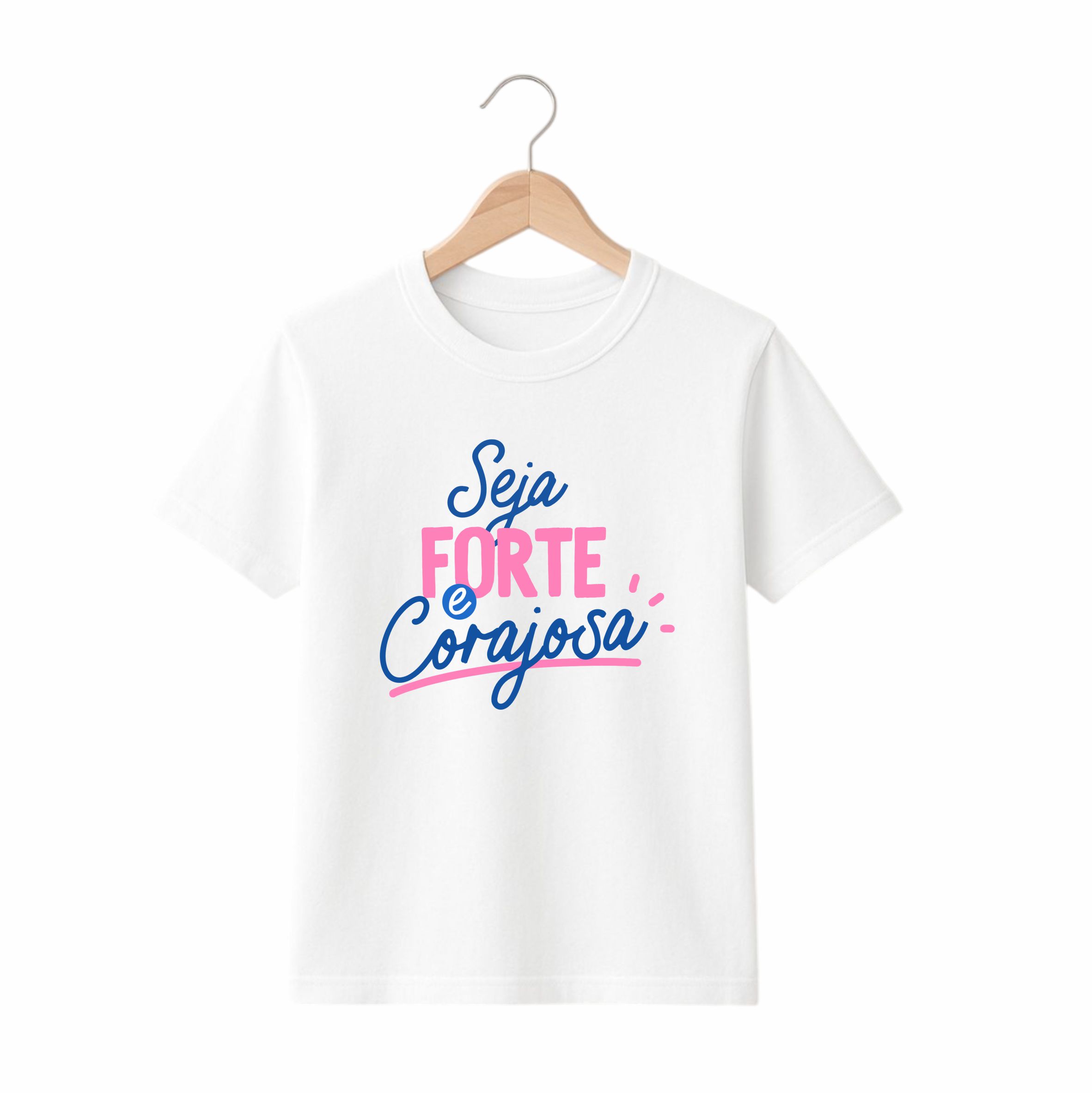 Camisa adulto - Seja forte e corajosa. Mangas curtas, cor branca, com gola redonda, confeccionada em malha 100% poliéster.